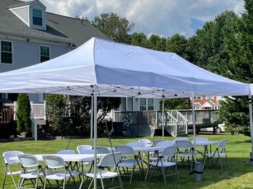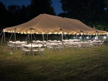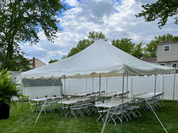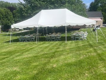 Price includes 20x20 pole tent with 6 - 6ft rectangular tables, 36 chairs or 4 - 60“ round tables, 32 chairs and delivery/set up