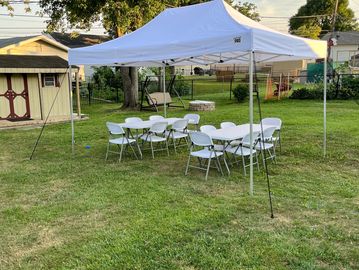 Price includes a 10x15 pop up tent, 2- 6ft rectangular tables, 12 chairs and delivery/set up (This tent can sit 16 people max). To accommodate 16 people upgrade the package to 2- 8ft tables and 4 additional chairs for $10 more.